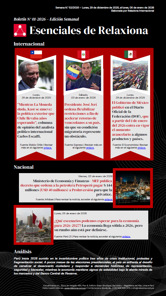 En esta edición N.° 01-2026 se analizan tres hechos internacionales clave: el debate sobre el rumbo de la política exterior chilena a partir de la columna del analista Carlos Escaffi; la entrada en vigor, desde enero de 2026, de nuevos aumentos arancelarios en México con efectos directos sobre el comercio exterior; y la decisión del presidente José Jerí de flexibilizar restricciones para facilitar el retorno de ciudadanos venezolanos. A nivel nacional, el MEF ordena a Petroperú el pago de S/ 144 millones a ProInversión en el marco de su proceso de privatización, mientras los análisis proyectan que el Perú inicia 2026 con una economía sólida, aunque marcada por alta incertidumbre política rumbo al ciclo electoral 2026-2027.